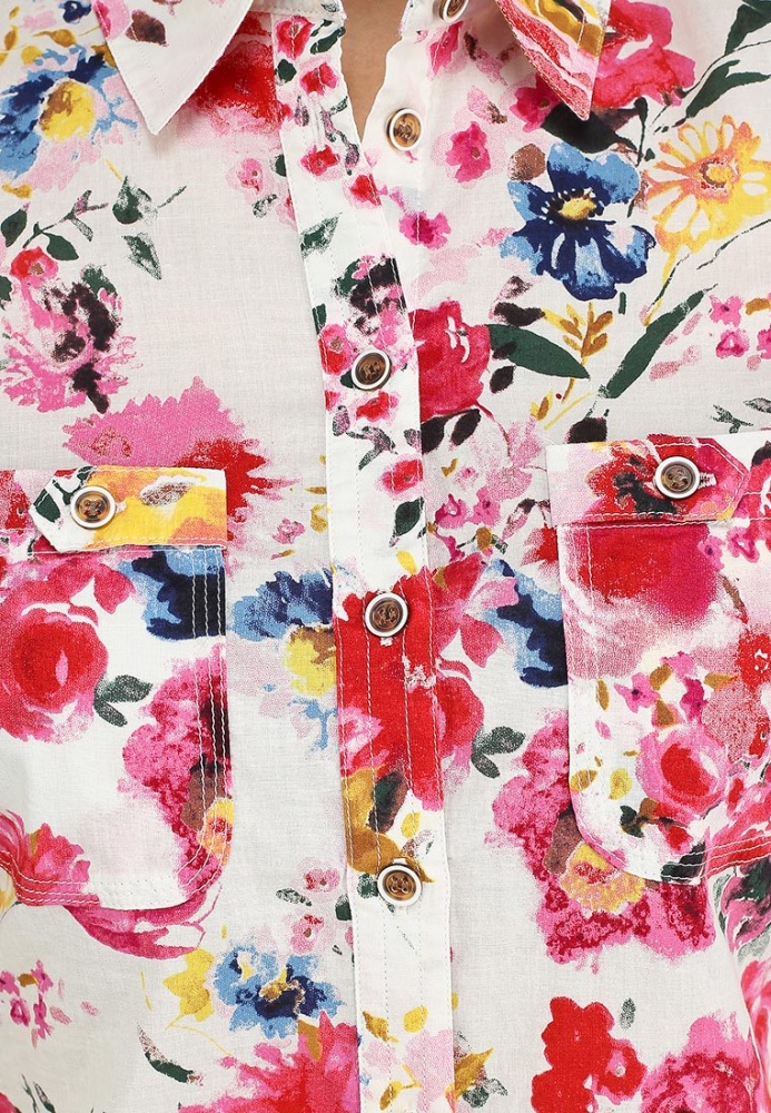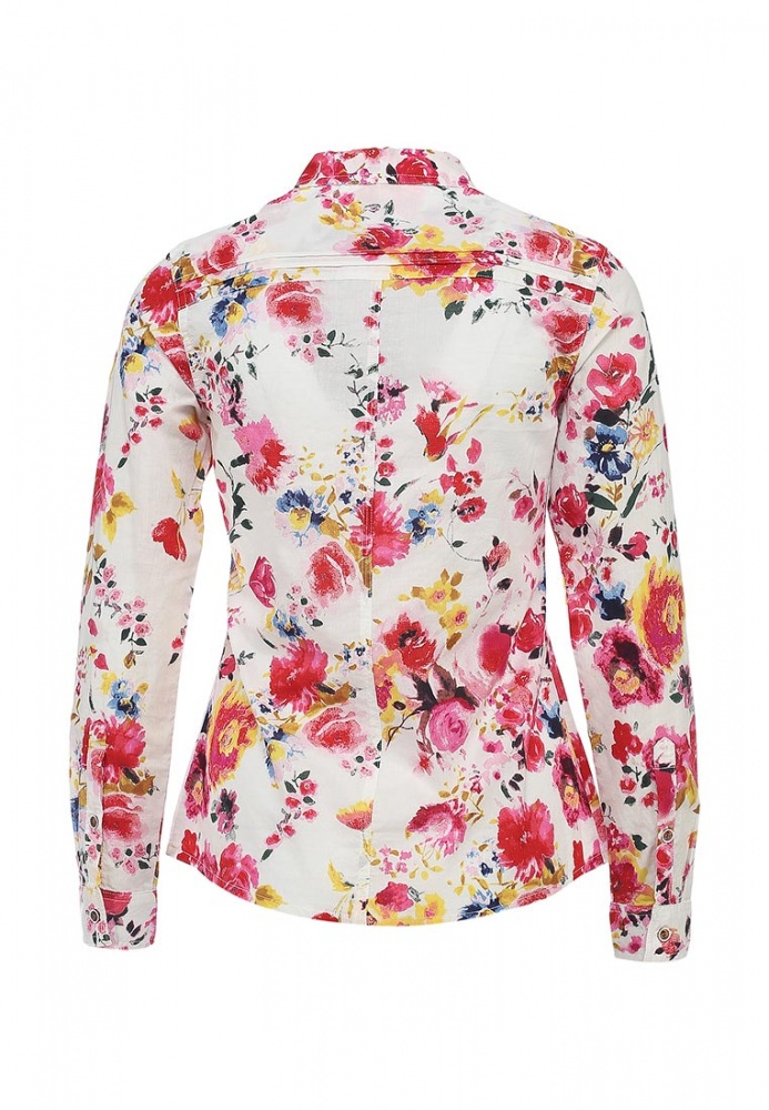 Блуза Sela выполнена из хлопкового материала. Детали: приталенный крой, отложной воротник, длинный рукав, манжеты и застежка на пуговицах, два нагрудных кармана, цветочный принт.