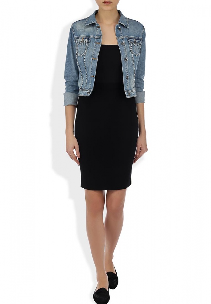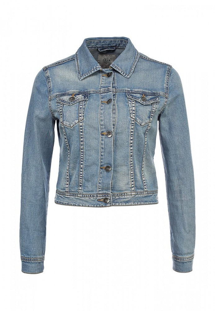 Джинсовая куртка Sela укороченного фасона выполнена из хлопкового денима светло-синего оттенка. Детали: прямой крой, отложной воротник, внешние карманы, контрастная строчка, декоративные потертости.